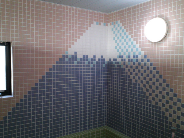 タイル張りの浴槽には日本古来を象徴したかのような「富士山」が浮かび上がる。